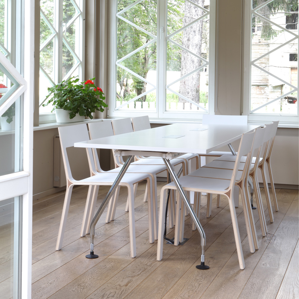 Poikkeuksellisesti sivuttain pinottava tuoli on pelkistetty, selkeä, muotokieleltään klassinen, mittasuhteiltaan tasopainoinen ja ergonominen. Neliön muotoinen aukko selkänojassa antaa tuolille keveyttä ja helpottaa tuolin liikuttelua. Framen puhdas ja esteettinen muotoilu vetoaa olemuksellaan ja sopii niin koteihin kuin julkisiin tiloihinkin.